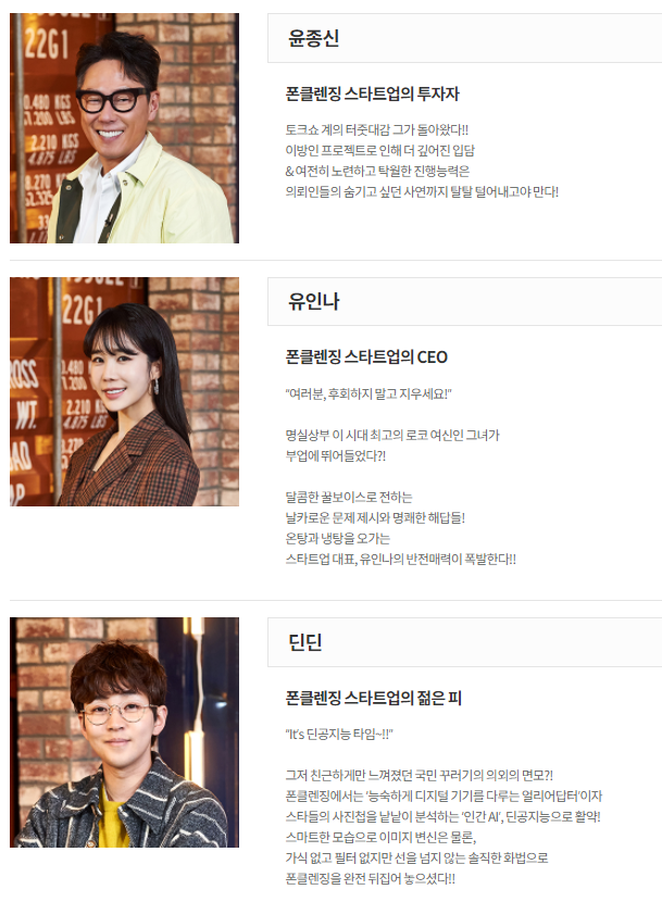 윤종신, 유인나, 딘딘이 3주간 신개념 ‘디지털 팝업 스토어’를 오픈한다는 콘셉트로, 각양각색 사연을 지닌 스타 의뢰인들의 휴대폰 속 사진첩을 정리해주면서 그에 얽힌 진솔한 토크도 나눌 예정입니다. 폰클렌징 본방을 시청 못하신 분들은 MBC 온에어를 통해 실시간TV다시보기로 시청가능합니다