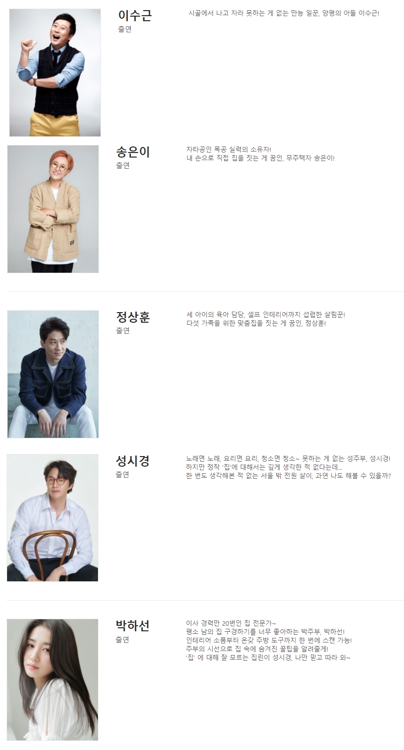 집들이에는 이수근, 송은이, 정상훈, 성시경, 박하선이 출연하며, 시골에서 나고 자라 못하는 게 없는 만능 일꾼 이수근은 모든 남성들의 로망인 ‘자연인 라이프’를 찾아 서울을 떠납니다.