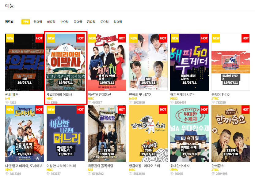 세빌리아의 이발사는 7월 11일 첫방송을 시작으로 계속 업데이트 될 것이며, 1페이지에 해당 프로그램이 없으시면 다음 페이지를 넘기면서 찾으시면 됩니다. 페이지를 넘겨서 찾는 게 불편하신 분들은 검색창을 이용하셔서 해당 프로그램을 찾으시면 됩니다.