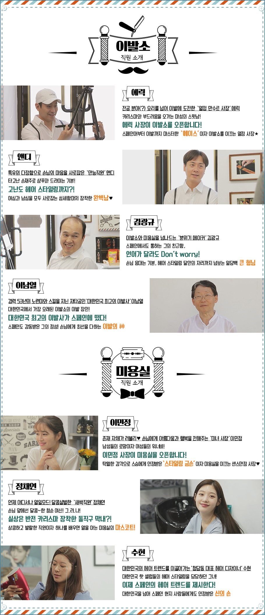 이민정, 정채연, 에릭, 앤디, 김광규, 수현이 출연하며 이발과 미용소재의 예능으로 5명의 멤버들이 헤어샵을 운영하는 모습을 담은 프로그램입니다.