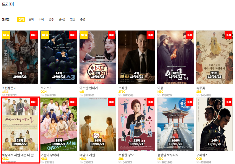 알려드린 사이트로 접속하면, 카테고리에 드라마 메뉴가 있습니다. 드라마 메뉴로 들어가면 현재 방송되고 있는 드라마들이 업데이트 되어 있습니다.