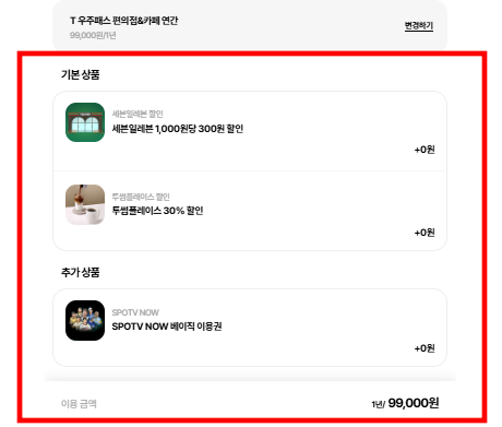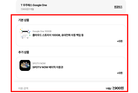 - 추가 혜택 1개 선택 (예: 구글 클라우드 100G, 투썸 플레이스 30% 할인등)