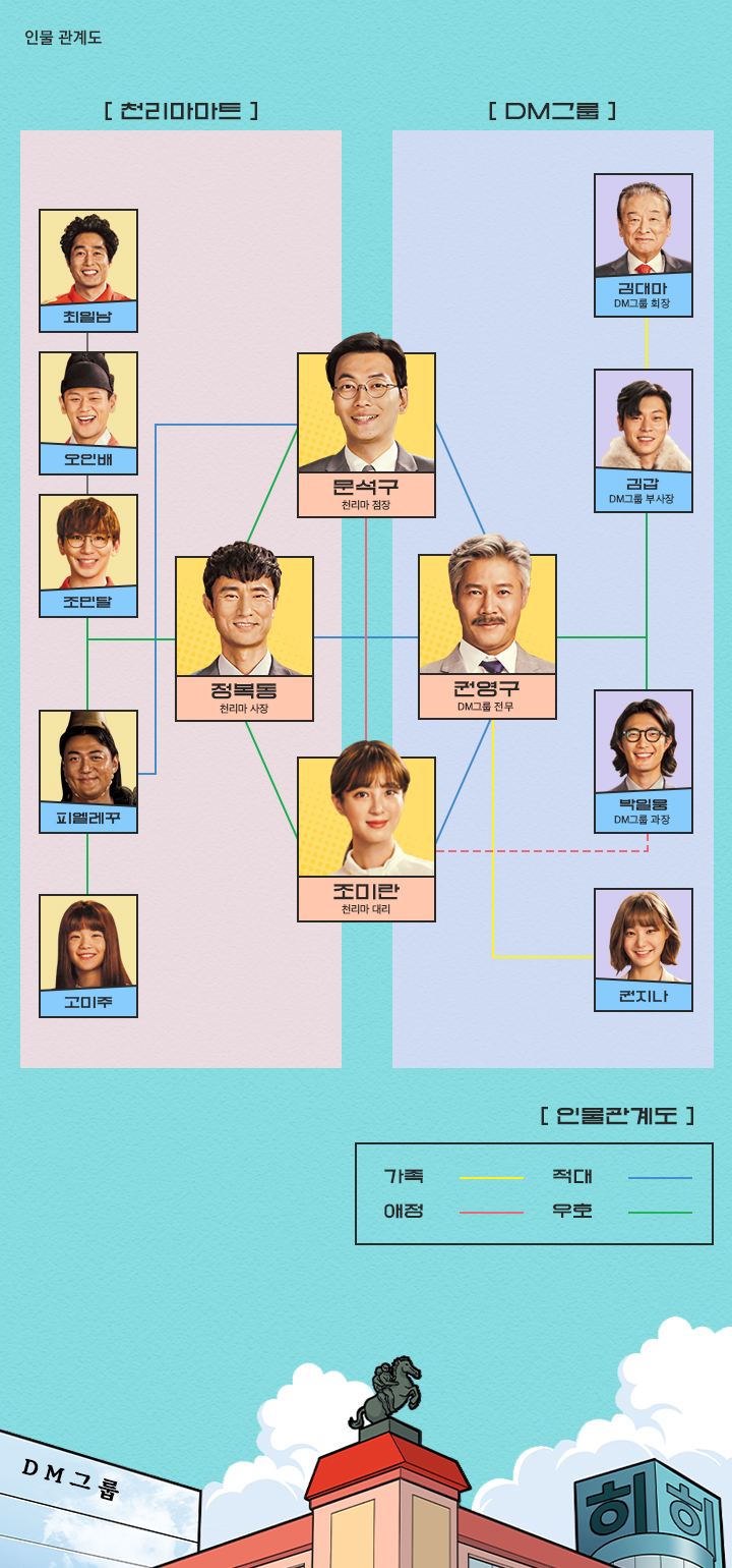 배우 이동휘는 재래시장에도 밀리는 천리마마트를 유통업계 1위로 만들고 싶은 점장 문석구로, 김병철은 천리마마트를 망가뜨려 대마그룹에 복수하려는 사장 정복동으로 분합니다. 박호산과 이순재, 정혜성은 각각 대마그룹 전무 권영구, 회장 김대마, 팀장 조미란을 맡았습니다.