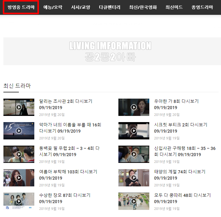 해당 사이트로 접속하면, 메뉴에서 방영중인 드라마 메뉴로 들어갑니다. 이 드라마 메뉴로 들어가면 현재 방송되고 있는 드라마들이 업데이트 되어 있습니다.