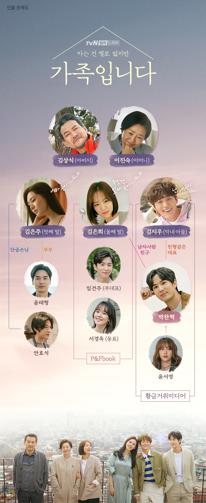 원미경과 정진영이 부부로 호흡을 맞추고, 추자현, 한예리, 신재하가 3남매로 등장할 예정입니다. 여기에 김지석이 한예리의 남사친이자 가족보다 가족을 더 잘 아는 든든한 친구로 등장하고, 신동욱도 한예리가 연기하는 김은희와 엮이게 되는 등 삼각관계 로맨스도 만들어냅니다.