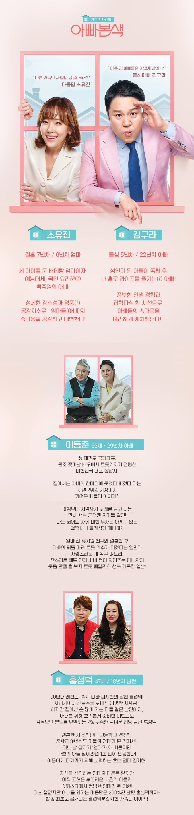 프로그램 소개 - 꾸밈없는 아빠들의 리얼한 일상 관찰과 스튜디오에서의 허심탄회한 공감 토크를 통해 지금까지 예능에서 외면받았던 '아빠', '가장'에 대한 이야기를 정면으로 다루고 말하지 못했던 그들의 속마음까지 들여다보는 프로그램