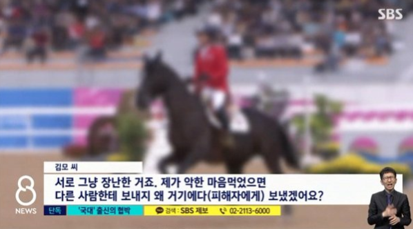 SBS 뉴스보도에서는 "승마 선수 김 씨가 만나다 헤어진 여성 A 씨에게 동의 없이 촬영한 사진과 영상을 보내며 한 달 동안 괴롭혔다"라고 단독 보도했습니다