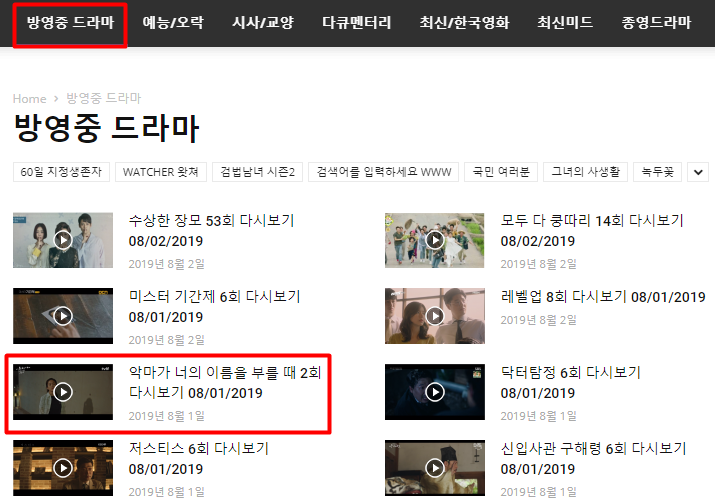 검색창에 드라마 제목 '악마가 너의 이름을 부를 때'를 입력하시고 검색버튼을 누르시면 해당드라마가 검색이 됩니다. 제목을 받드시 띄어 쓰기 해야 검색이 됩니다. 1회부터 시청 가능하며, 8월 1일자 2회를 눌러서 시청해봤는데, 제법 나쁘지 않은 화질로 끊기지 않고 볼 수 있었습니다. 아래를 참조하여 정경호 박성웅 주연의 본 드라마를 시청하시기 바랍니다.