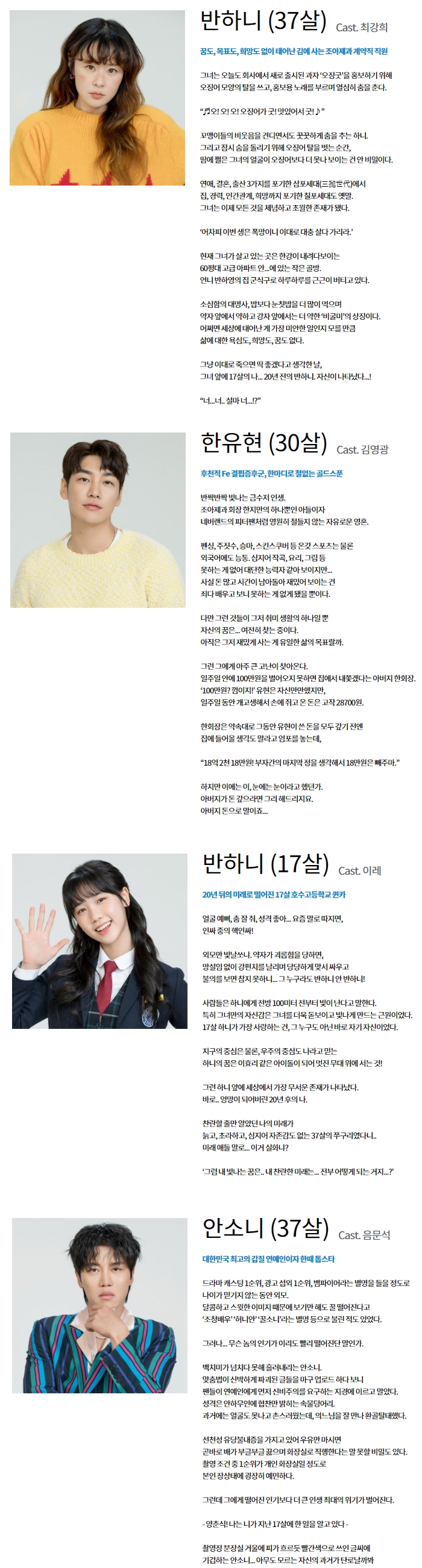 반하니의 17살 시절은 이레가 연기하는데요. 호수고등학교 퀸카로 전성기를 살아가는 그는 20년 뒤 미래로 떨어져 자신과 마주합니다. 음문석은 과거 대한민국 최고의 연예인이자 한때 톱스타였던 안소니 역을 맡습니다.