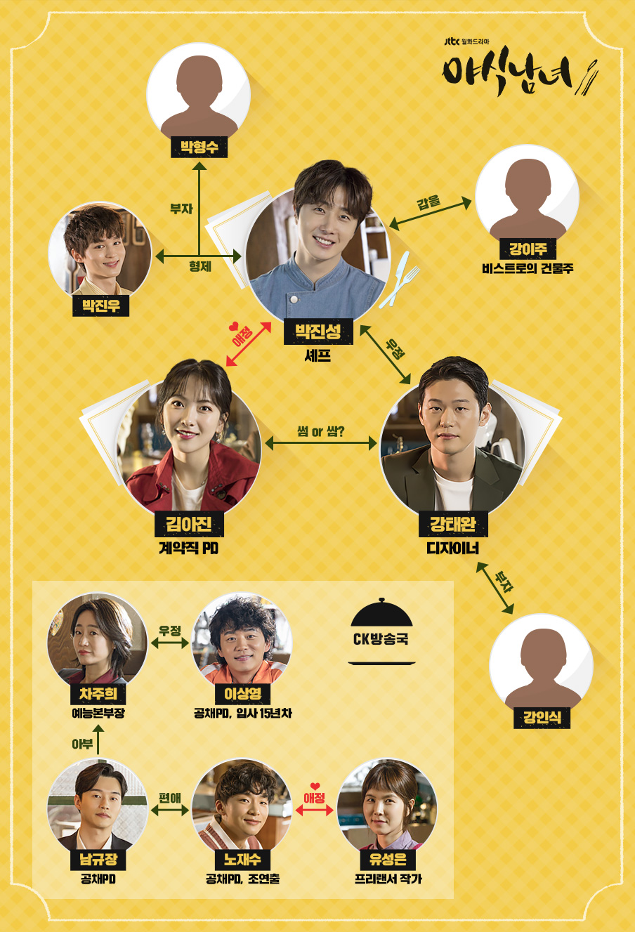 야식 힐링 셰프 박진성(정일우), 열혈 피디 김아진(강지영), 잘 나가는 천재 디자이너 강태완(이학주)의 설렘을 자아내는 밝고 산뜻한 케미가 가득한데요. 사실 이들의 삶이 이미지처럼 유쾌한 것만은 아닙니다.