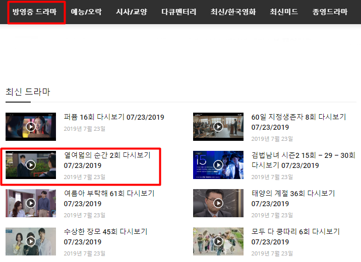 본 사이트 메인 페이지로 접속하면, 방영중인 메뉴가 있고, 이 메뉴로 들어가면 현재 방송되고 있는 드라마들이 업데이트 되어 있습니다.