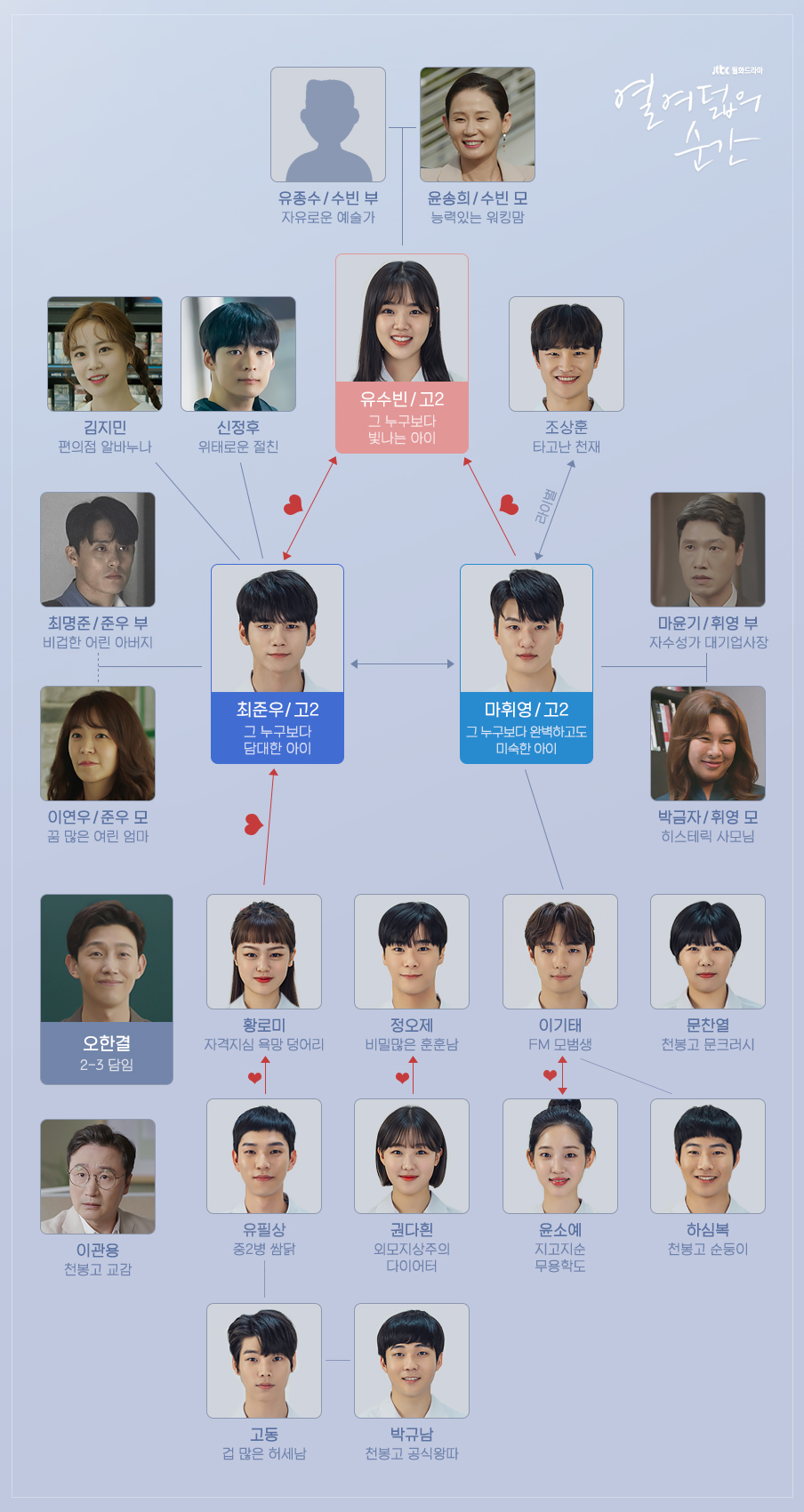 질풍노도 청춘들의 이야기를 담은 '열여덟의 순간'의 등장하는 주요 인물들의 인물관계도는 그 누구보다 담대한 아이 '준우'와 누구보다 빛나는 아이 '수빈'은 서로에게 새로운 감정을 느끼며 호감을 갖고 있는 관계이며, 이러한 '수빈'을 '휘영'이는 중학교 때부터 혼자서만 좋아하고 있습니다.