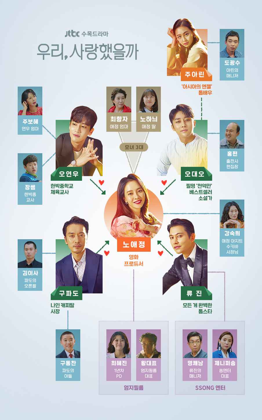 JTBC에서 방송하는 수목드라마 우리 사랑했을까는 ‘우리사랑’은 14년 차 생계형 독수공방 싱글맘 앞에 나쁜데 끌리는 놈, 잘났는데 짠한 놈, 어린데 설레는 놈, 무서운데 섹시한 놈이 나타나면서 두 번째 인생의 시작을 알리는 ‘4대 1 로맨스’드라마입니다.