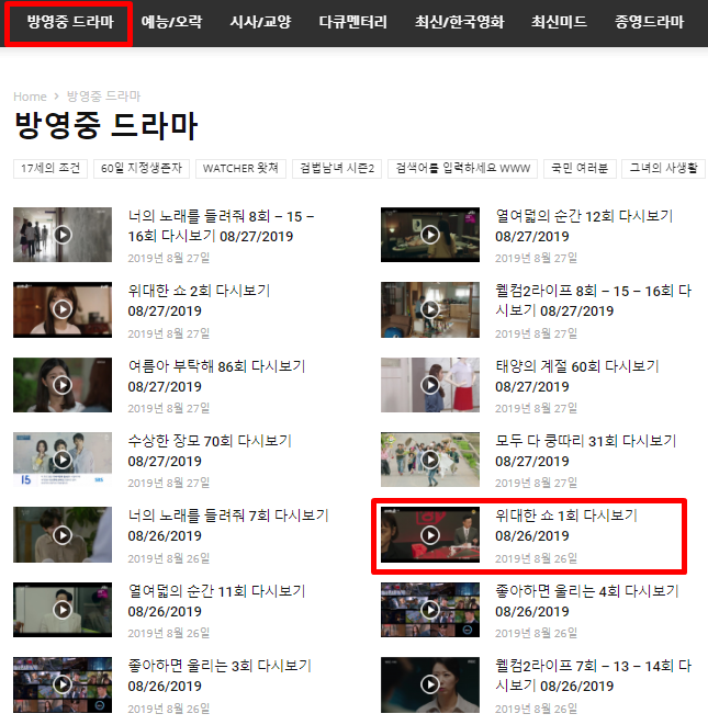 해당 사이트로 접속하면, 카테고리 메뉴에서 드라마 메뉴로 다시 들어갑니다. 드라마 메뉴로 들어가면 현재 방송되고 있는 드라마들이 업데이트 되어 있습니다. 현재 해당 드라마는 1페이지 상단에 위치해 있으며, 다른 드라마들이 업데이트 되면 다음 페이지로 밀리게 됩니다.