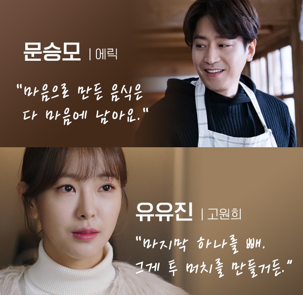 에릭은 극 중 전 세계를 돌아다니며 한식 팝업 레스토랑을 오픈, 출중한 요리 실력으로 모두를 매료시킨 셰프 문승모 역을 연기합니다. 고원희는 극 중 뛰어난 능력으로 데뷔 때부터 스포트라이트를 받은 패션 디자이너 유벨라를, 안내상은 냉혈한 사업가 임철용을 맡아 활약합니다.