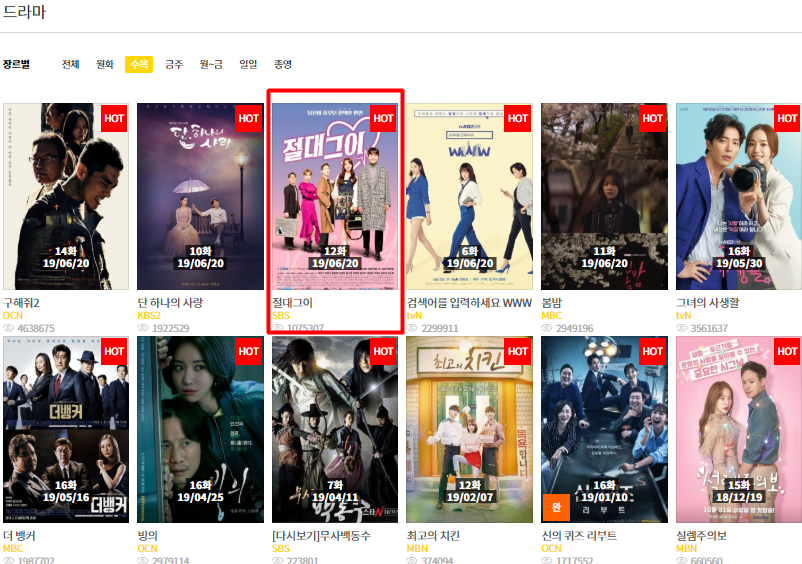 절대그이는 현재 1 페이지 상단에 위치에 있는데, 다른 드라마가 계속 업데이트 됨에 따라 뒤로 밀립니다. 첫 페이지에 해당 드라마가 보이지 않으면, 페이지를 넘기면서 찾으시면 됩니다. 페이지를 넘겨서 찾는 게 불편하신 분들은 검색창을 이용하셔서 해당 드라마를 찾으시면 됩니다.