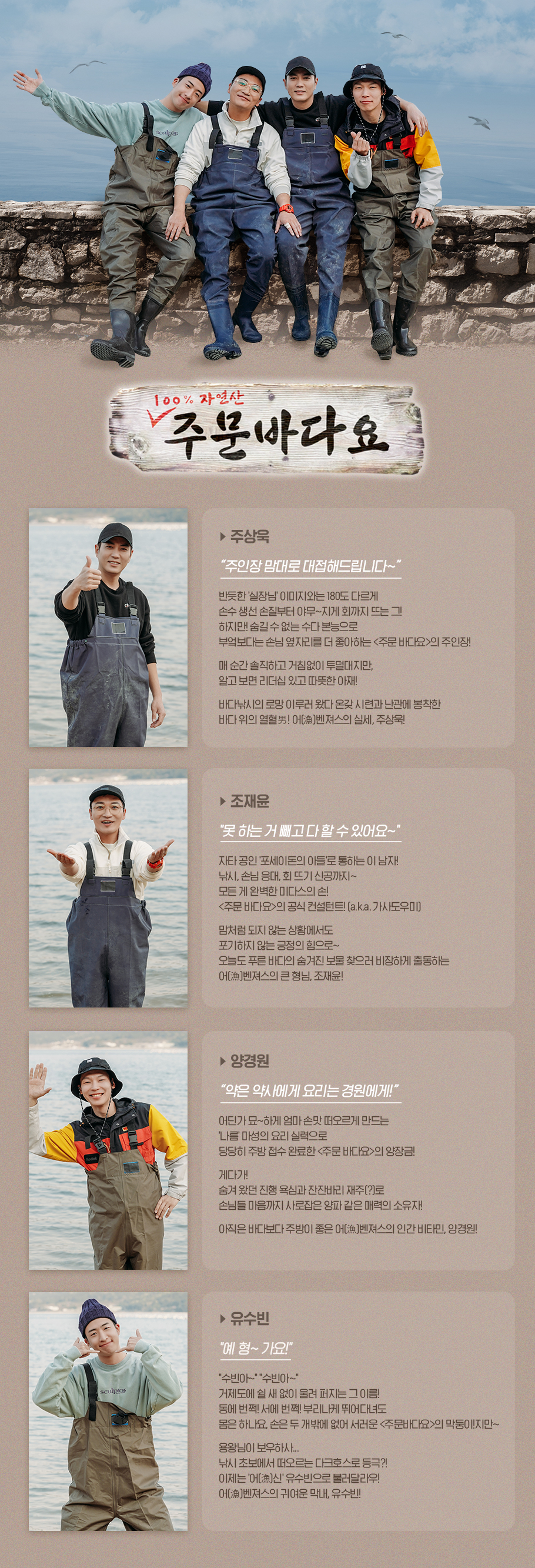 ‘주문 바다요’에서는 어부로 변신한 배우 주상욱, 조재윤, 양경원, 유수빈이 첫 손님에게 제공할 자연산 먹거리를 채취하기 위해 바다로 나서는 모습이 그려집니다. 또한 친형제 케미를 예고한 네 사람의 첫 만남도 공개될 예정입니다.
