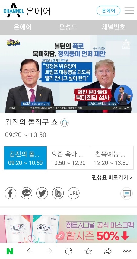 온에어는 당일날짜에만 무료로 시청 할 수 있으니 편성표를 통해 프로그램 시간대를 잘 알아두셨다가 시청하시면 됩니다.