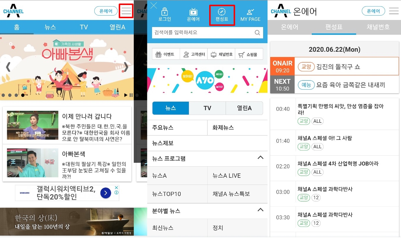채널A 메인에서 메뉴로 들어가면 편성표 메뉴가 나옵니다. 편성표를 확인해 시청하고 싶으신 프로그램 시간을 알아 두셨다가 바로 시청 하시면 됩니다.