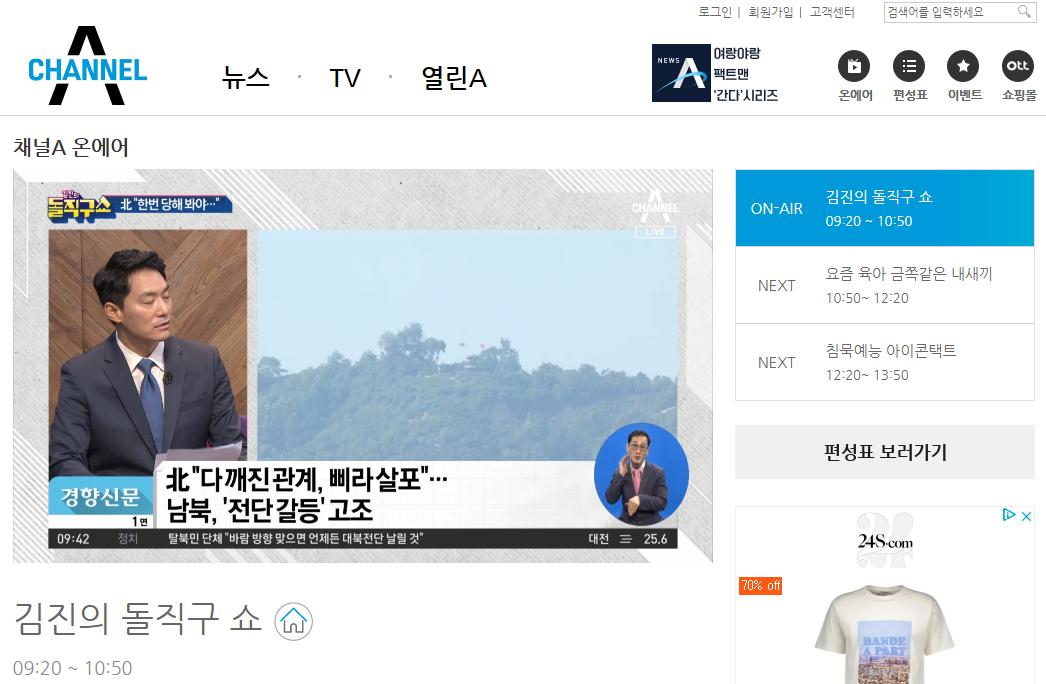 현재 방송중은 김진의 돌직구 쇼를 눌러 시청해봤는데요. 고화질로 잘 나오는 걸 확인 할 수 있었습니다.