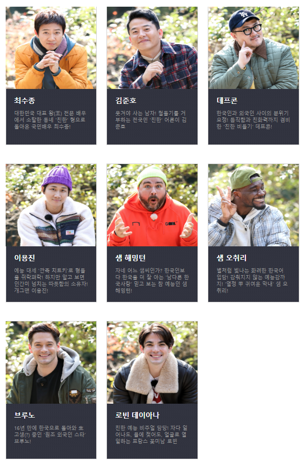 출연진 - 최수종, 김준호, 데프콘, 이용진, 샘해밍턴, 샘오취리, 브루노, 로빈데이아스
