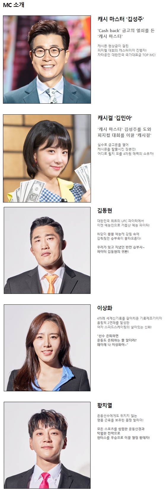 출연진 - 김성주, 김민아, 김동현, 황치열, 이상화