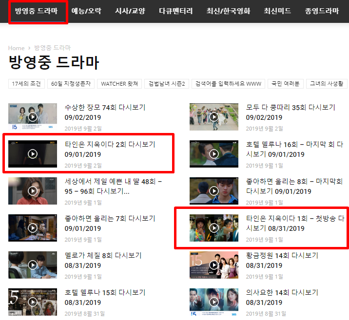 이 사이트에 접속하시면 메인화면에 방영중인 드라마 메뉴가 나옵니다. 드라마 메뉴로 들어가시면, 현재 방영하고는 모든 채널에 드라마들이 업로드 되어 있습니다. 해당 드라마를 쉽게 찾는 방법은 검색창을 이용해서 찾는 방법입니다.