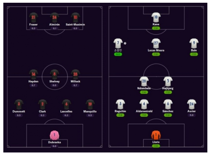 GK: 위고 요리스(1) / DF: 세르지 오리에(24), 다비손 산체스(6), 토비 알더베이럴트(4), 세르히오 레길론(3) / MF: 피에르-에밀 호이비에르(5), 탕귀 은돔벨레(28), 가레스 베일(9), 루카스 모우라(23), 손흥민(7) / FW: 해리 케인(10)