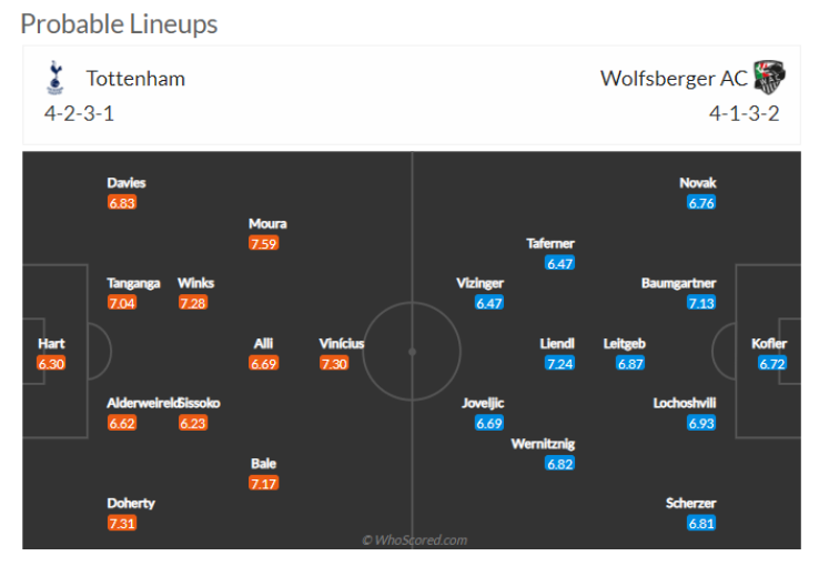 이 매체의 예상에 따르면 최전방에는 카를로스 비니시우스가 원톱으로 출격합니다. 그 아래 공격 라인에 루카스 모우라-델리 알리-가레스 베일이 나란히 섭니다. 3선에는 해리 윙크스,시스코 위치하고, 수비수로는 맷 도허티, 알데르베이럴트,자펫 탕강가,벤 데이비스, 골문은 조 하트가 지킬것으로 예상하고 있습니다.
