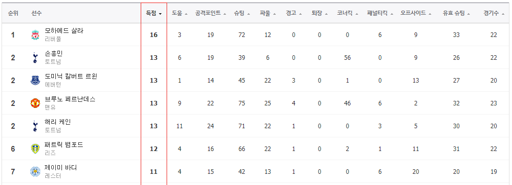 손흥민과 살라의 EPL 득점왕 경쟁도 많이 벌어져있습니다. 최근 손흥민의 1골을 넣었지만 살라는 1골을 추가로 더 넣으면서 다시 3골차가 되었네요. 현재 2위 순위에 4명의 선수가 동률이네요.