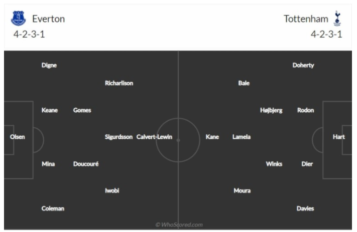 영국 후즈코어스 닷컴은 토트넘 라인업을 4-2-3-1 포메이션을 점쳤다. 부상에서 복귀한지 얼마 되지 않은 해리 케인을 평소 같았으면 출전시키지 않았을 것으로 보일 수 있지만 상대가 에버튼인 만큼 선발 출장할 것으로 예상되었습니다. 손흥민이 최근 거의 모든 경기를 선발 출장하였기 때문에 체력을 고려해 교체 명단에 이름을 올릴 것으로 예상되며 은돔벨레의 최근 경기력은 매우 좋으나 손흥민과 마찬가지로 체력을 생각해 선발 출전하지 않을 것으로 보이고 그 자리에 라멜라가 대신 나올 것으로 보입니다.