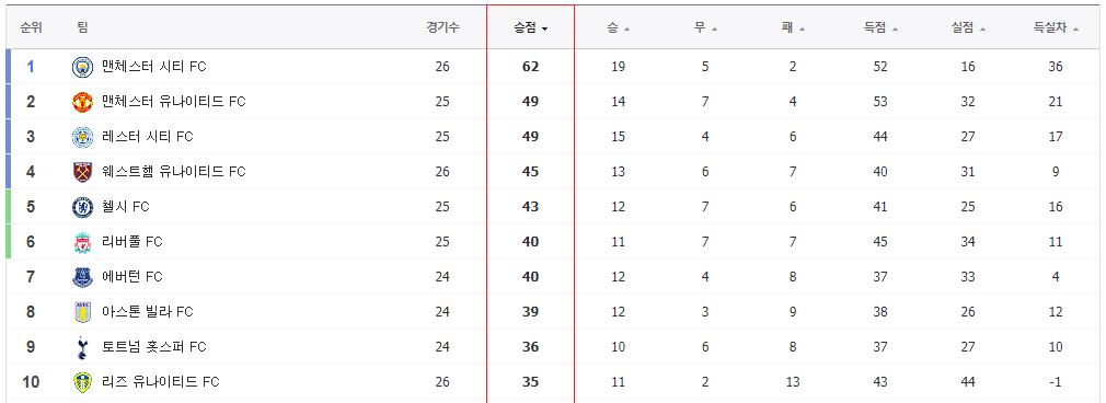 EPL 팀 순위 및 손흥민 득점순위
