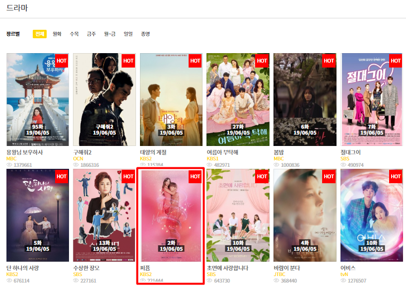 알려드린 사이트로 접속하면, 카테고리에 드라마 메뉴가 있습니다. 드라마 메뉴로 들어가면 현재 방송되고 있는 드라마들이 업데이트 되어 있습니다.