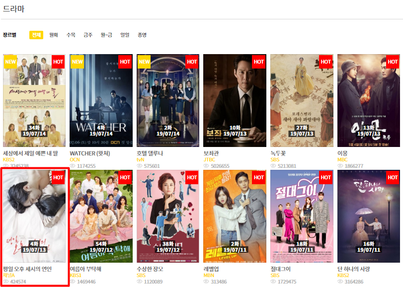 현재 평일 오후 세시의 연인은 첫 페이지 두번째 위치에 있는데, 첫 페이지에 해당 드라마가 보이지 않으면, 페이지를 넘기면서 찾으시면 됩니다. 페이지를 넘겨서 찾는 게 불편하신 분들은 검색창을 이용하셔서 해당 드라마를 찾으시면 됩니다.