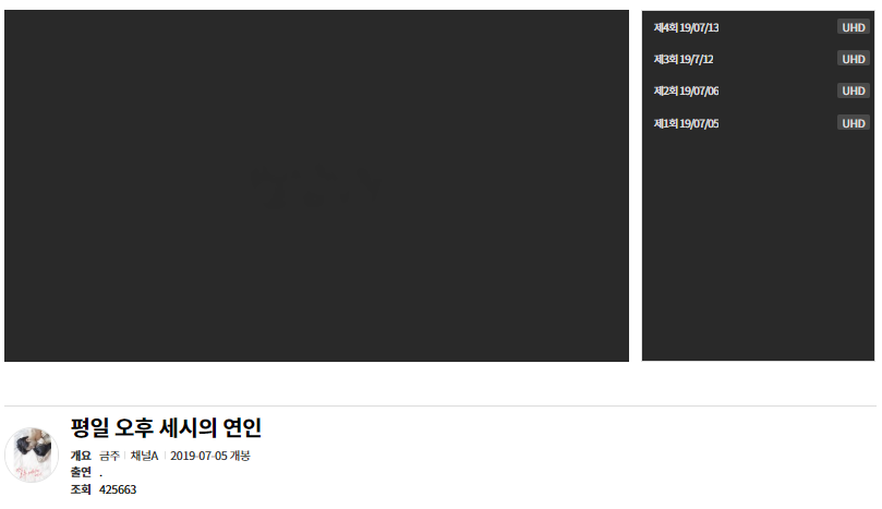 검색창에 드라마 제목 '평일 오후 세시의 연인'을 입력하시고 검색버튼을 누르시면 해당드라마가 검색이 됩니다. 드라마 제목을 반드시 띄어쓰기를 하셔야 검색이 됩니다. 최근 방송한 제4회를 눌러서 시청해봤는데, 나쁘지 않은 화질로 잘 오는 걸 볼 수 있었습니다. 아래를 참조하여 평일 오후 세시의 연인을 시청하시기 바랍니다.