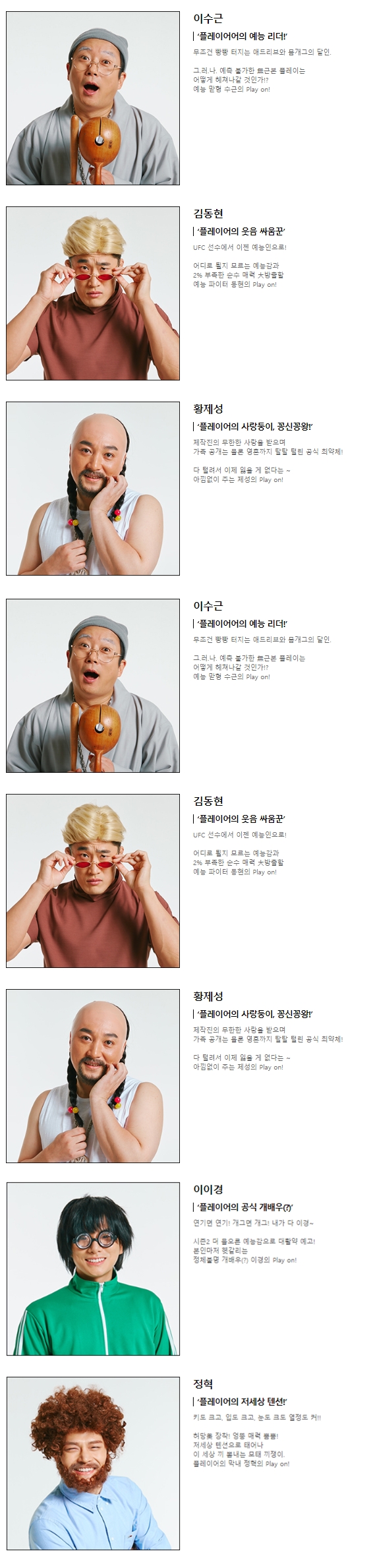 ‘플레이어2’에는 기존 이수근, 김동현, 황제성, 이용진, 이진호, 이이경, 정혁에 이어 황치열이 새 멤버로 합류했습니다