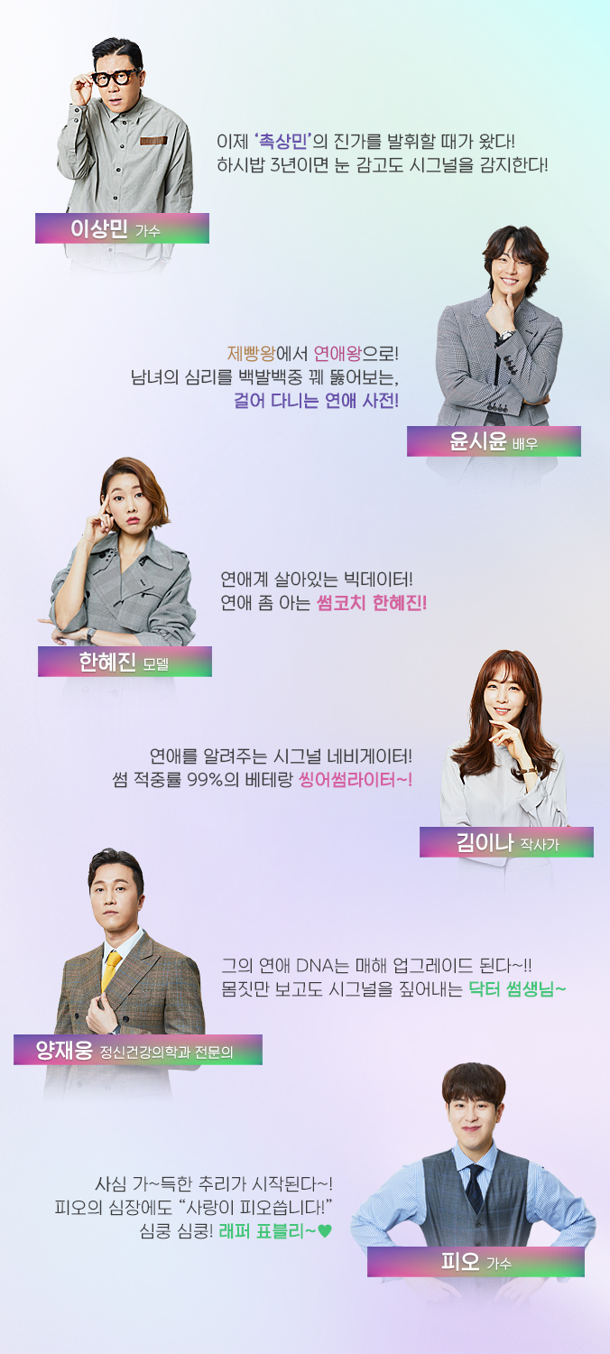 프로그램 소개 - 시그널 하우스에 입주하게 된 청춘 남녀들이 서로 ‘썸’을 타고, 연예인 예측단이 이들의 심리를 추리하는 리얼리티 프로그램