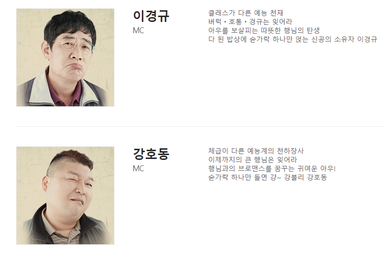 한끼줍쇼는은 강호동, 이경규 두 거장 MC 메인으로 매주 게스트를 초대해 집집 마다 돌아다니며 한끼를 같이 해결합니다.