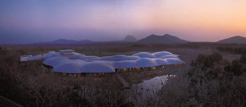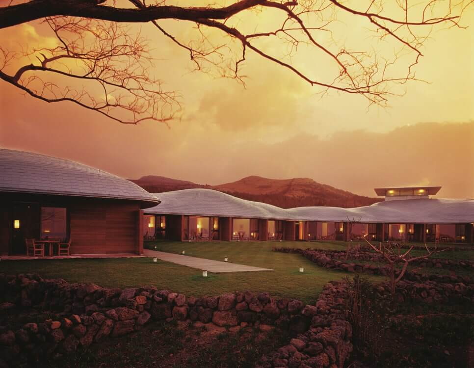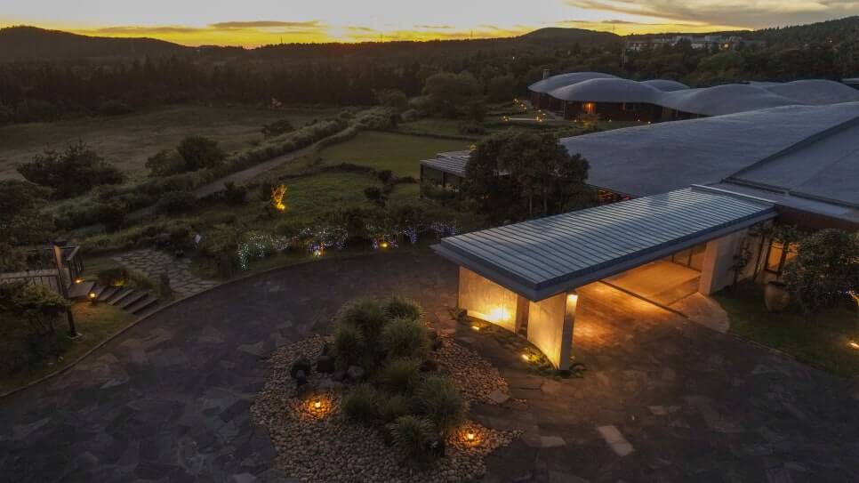 다도리조트라는 이름은 드라마 속 설정일 뿐, 실제 이름은 핀크스 포도호텔입니다. 세계적인 일본계 재일 건축가 이타미 준이 설계한 이 호텔은 제주 오름과 초가집에서 영감을 받아 지어진 예술적 건축물로, 하늘에서 보면 포도송이처럼 보인다 하여 ‘포도호텔’이라는 이름이 붙여졌습니다.