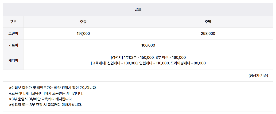 시즌과 요일에 따라 요금이 다르며, 대중 골프장이므로 비회원 이용 가능합니다.
