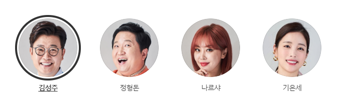 출연진 - 김성주, 정형돈, 나르샤, 기은세