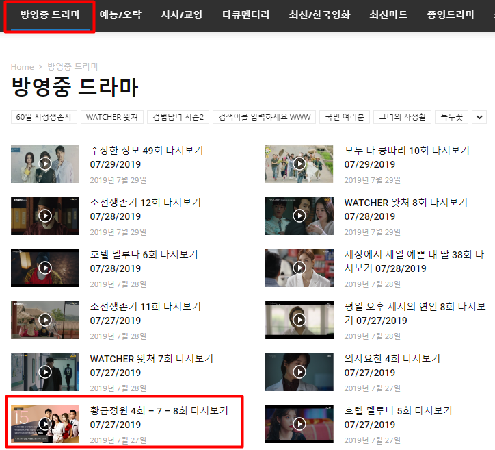위 사이트 접속하면, 방영중인 드라마메뉴에서 바로 들어갑니다. 이 메뉴로 들어가면 현재 방송되고 있는 드라마들이 업데이트 되어 있는 걸 보실 수 있습니다.