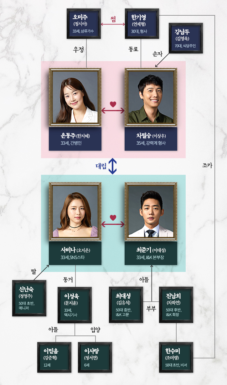 인물관계도 속에는 은동주-차필승(이상우)-사비나(오지은)-최준기(이태성)-강남두(김영옥)-진남희(차화연)-최대성(김유석)-신난숙(정영주)-한수미(조미령)-오미주(정시아)의 얽히고 설킨 관계가 한 눈에 파악되 극에 대한 기대감을 상승시키고 있습니다.