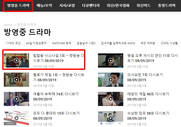 이 사이트로 접속하시면 메인화면 상단에 방영중인 드라마 메뉴가 있습니다. 이 메뉴를 눌러서 들어가면 각 종 드라마들이 업데이트 되어 있습니다.