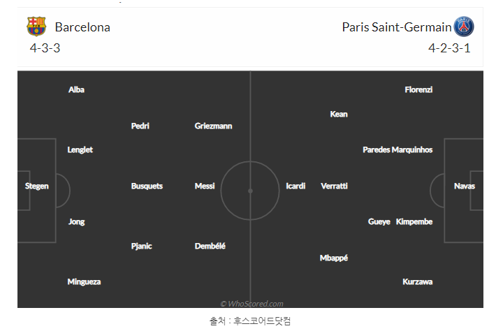 바르셀로나와 파리 생제르망 두 팀의 예상 선발 라인업은 FC 바르셀로나는 4-3-3 포메이션이 예상되며, 최전방 쓰리톱에 그리즈만, 메시, 우스망 뎀벨레, 중원은 페드리, 부스케츠, 피아니치, 포백은 알바, 랑글레, 데 용, 밍구에사, 골문은 테어 슈테겐이 지킬것으로 봤습니다.