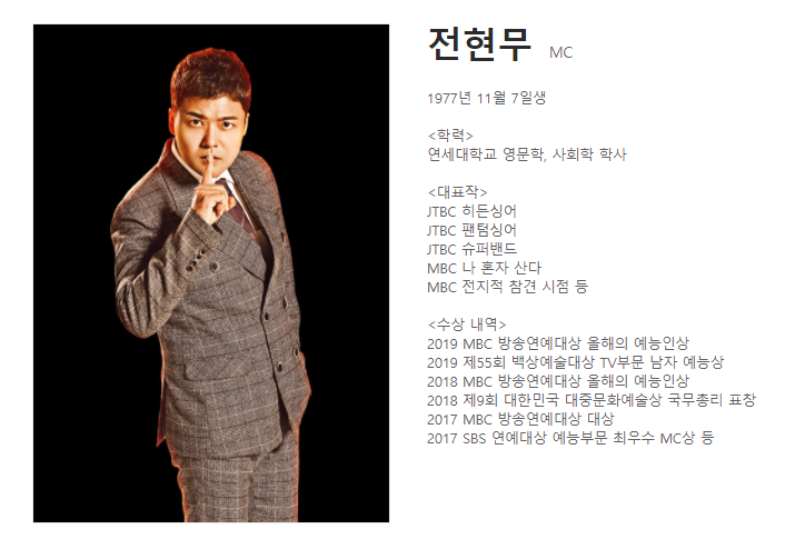히든싱어6 지난 시즌들의 이어 전현무가 단독 MC맡았고, 여러 연예인 패널들과 함께합니다.