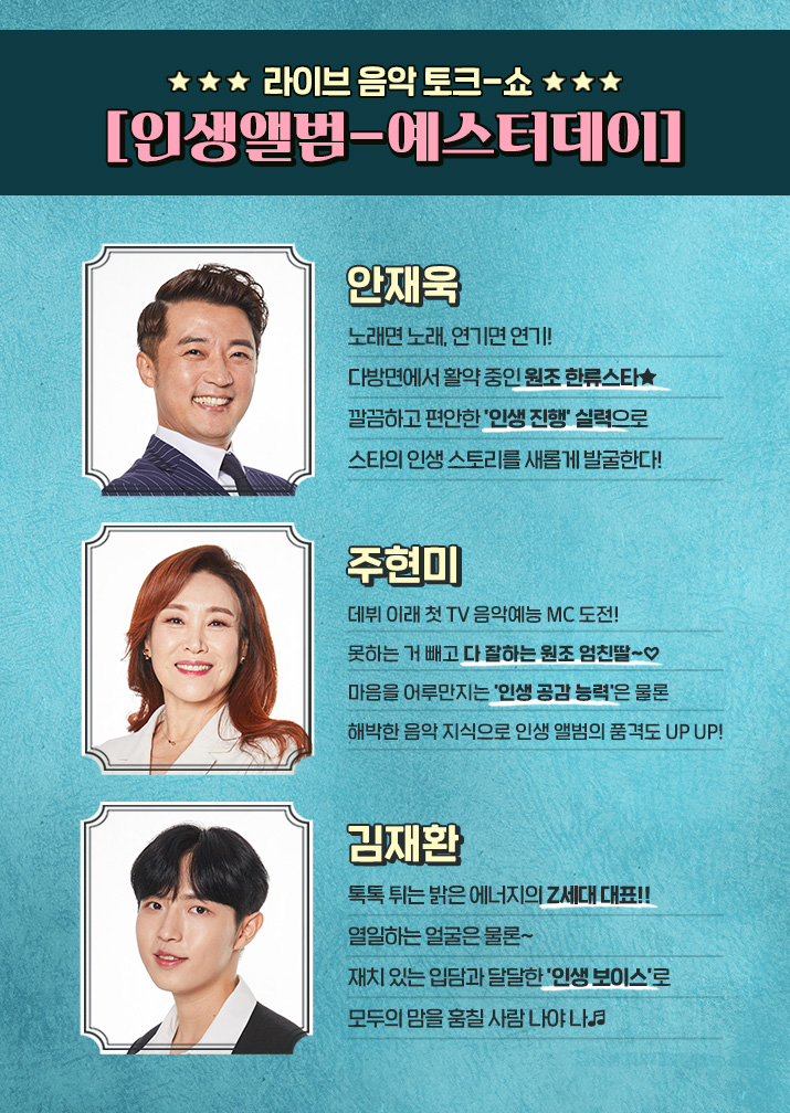 MBN 예능 ‘인생앨범 - 예스터데이'는 매주 초특급 스타를 초대해 10여 명의 '인생곡 가수단'이 게스트의 인생을 표현한 무대를 각자 선보이며 이야기를 나누는 음악 토크쇼 프로그램입니다.