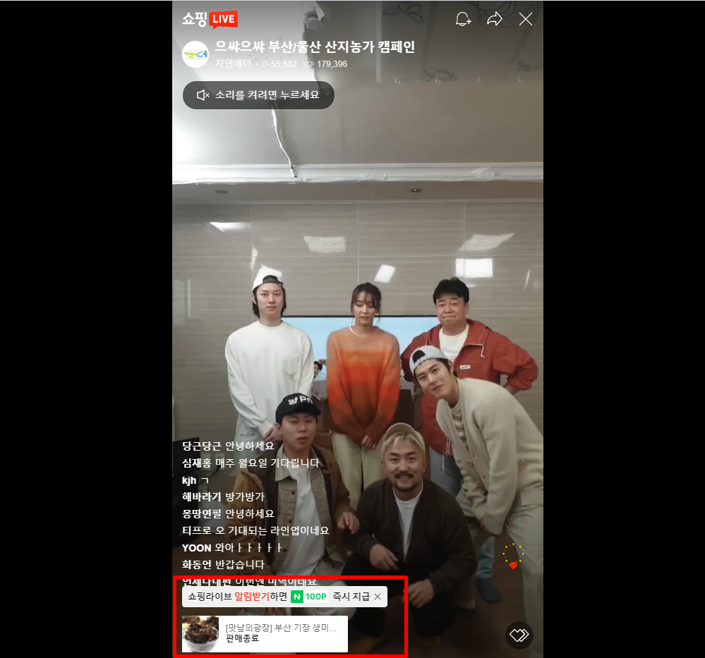 검색창에 맛남의 광장을 검색하시면 멤버들이 홍보하는 라이브 영상들이 있습니다. 원하는 제품의 영상을 눌러 들어갑니다.