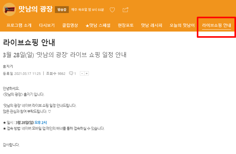 맛남의 광장 시청하시는 분들은 대부분 방영시간에 구매하는 것으로 많이 오해하고 계신데 방영시간이 아닌 구매 시간이 따로 공지가 됩니다. 해당 홈페이지로 접속하시면 라이브쇼핑 안내로 메뉴로 들어가면 일시와 접속방법이 나와있습니다.
