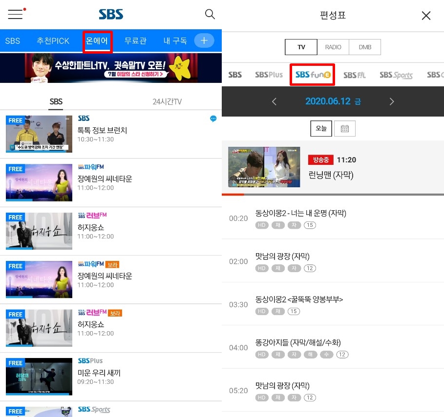 온에어는 당일날짜에만 무료로 시청 할 수 있으니 편성표를 통해 프로그램 시간대를 잘 알아두셨다가 시청하시면 됩니다.